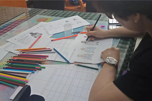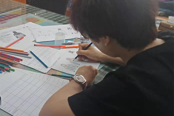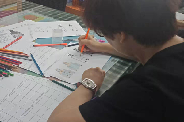 盡管困難重重,我們也要想進一切辦法做到,不僅要做好,而且要做到最好!我們的總經(jīng)理自己也搖身一變設(shè)計師——畫稿,可以看到以下的圖片,認真、負責的態(tài)度,用心的為客戶所思,一筆一筆的畫好,一點點的涂好顏色;還有一個紙樣哥哥也在幫忙畫,他們兩個人在一兩天的時間內(nèi)要畫好接近10個款衣服和褲子,雖然我們的時間不多,但是睿牛的小伙伴們也是很努力的去做,努力過就不曾后悔。