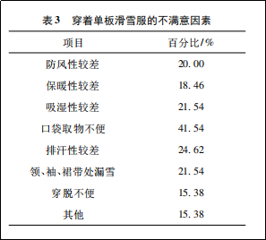接下來作者又對消費者穿著單板滑雪服不滿意因素進行調查,結果如下。