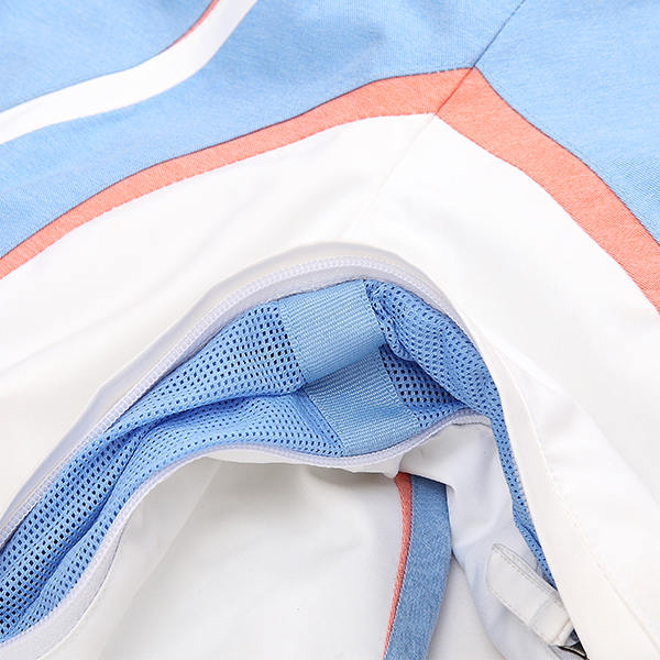 有些沖鋒衣的面料整體如同單層面料,銀灰色為通常的里料顏色,里料連接部位還能看到壓膠條。另外一種沖鋒衣是由獨(dú)立的兩個(gè)分層材料縫制而成,外表層面料是通過(guò)把具有防水功能且透氣性良好材料制成有特殊保護(hù)的織物組織結(jié)構(gòu)。此類外表面料的外層起防水透氣作用,內(nèi)層主要起排汗作用。里料層是另一層獨(dú)立的織物,里料和面料是可分開的,里料色彩一般為暗色,主要由錦綸材料、棉纖維之類吸汗材料制成,結(jié)構(gòu)主要以網(wǎng)格為主,面料的拼合部位的壓膠通常會(huì)被里料遮蓋住,只有網(wǎng)格結(jié)構(gòu)的里料才能看到壓膠處。
