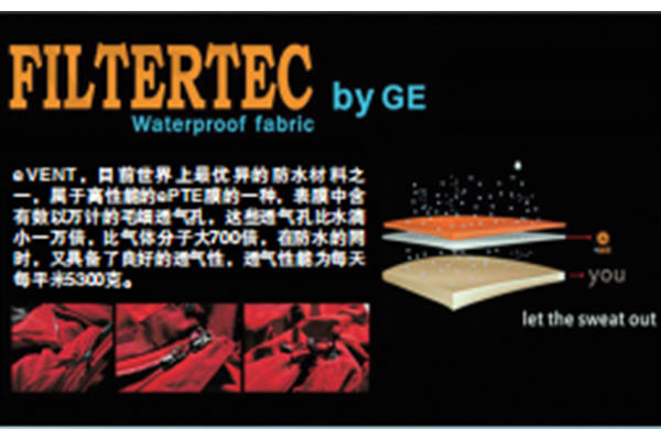 則EVENT使用了GORE-TEX面料的品牌沖鋒衣售價高達幾千上萬元,一般的戶外愛好者常常只能是“望衣興嘆”。而誕生比GORE-TEX略晚的EVENT面料的性價比似乎要高一些,兩者都被稱為頂級沖鋒衣的面料。EVENT技術上使用了與GORE-TEX完全不同的思路,它使用一種全新的EPTFE織物(不是覆膜)工藝,這種織物具有極其穩(wěn)定的化學性能,適用的溫度范圍更廣,而且耐老化。面料層的小孔雖然比EPTFE覆膜的分子透氣孔大,但是依然能夠稱職地將雨水阻隔在面料外部,即使最小的水珠(霧珠)也不能輕易通過。而且擴大的透氣孔讓透氣性能幾乎與傳統(tǒng)織物面料沒有差別。