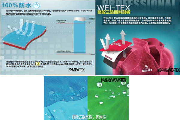 威科技WEI-TEX:WEI-TEX面料是吳江同洲紡織有限公司主打的面料品牌之一,具有良好的防風(fēng)防水及透濕透氣特性,是北京大臺(tái)北戶外及駱駝圣弗萊戶外的主打面料。WEI-TEX面料采用的是PU聚氨酯材質(zhì),這一點(diǎn)與大部分面料一樣。