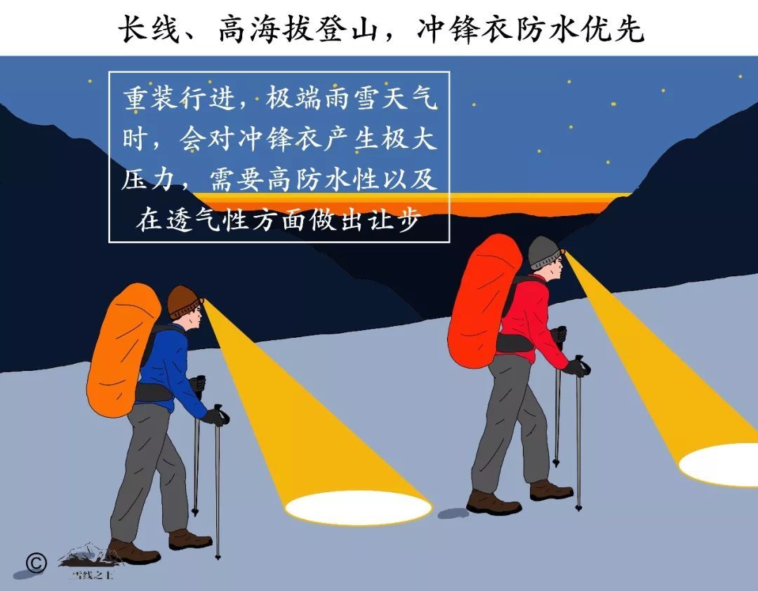 沖鋒衣的防水性與透氣性不可兼得,你在選購時(shí),就不能指望買一件“全能型”沖鋒衣,而應(yīng)該根據(jù)自己的戶外活動(dòng)類型來平衡。