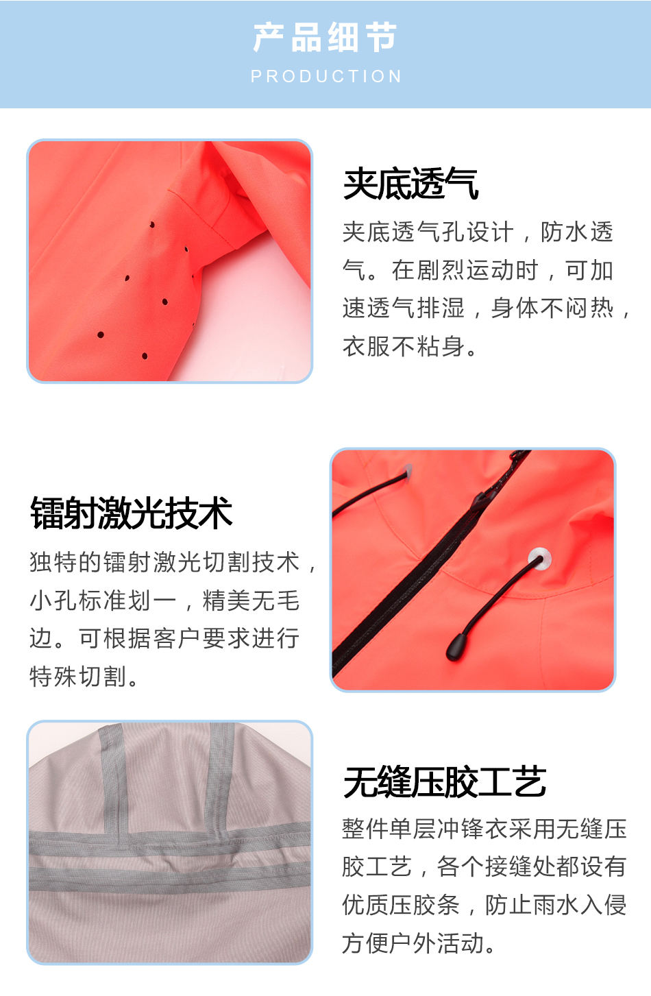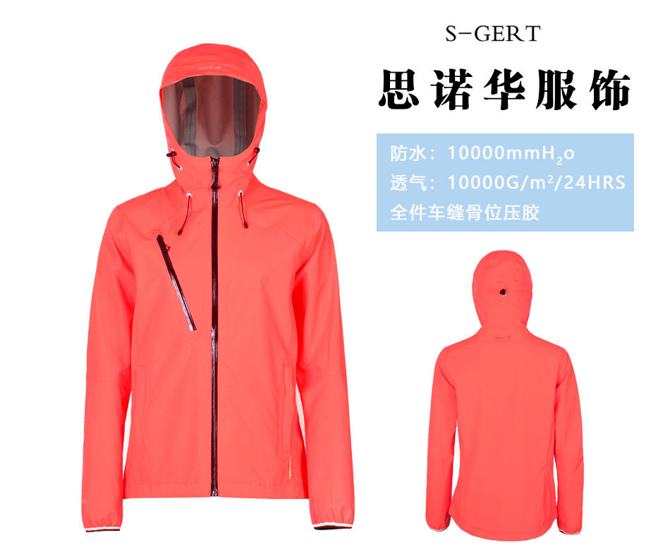 無縫壓膠工藝:整件單層壓膠沖鋒衣采用無縫壓膠工藝,各個接縫處都設(shè)有優(yōu)質(zhì)壓膠條,防止雨水入侵方便戶外活動。