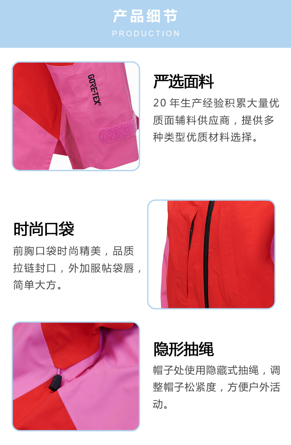 隱形抽繩:單層沖鋒衣代工其帽子處使用隱藏式抽繩,調整帽子松緊度,方便戶外活動。