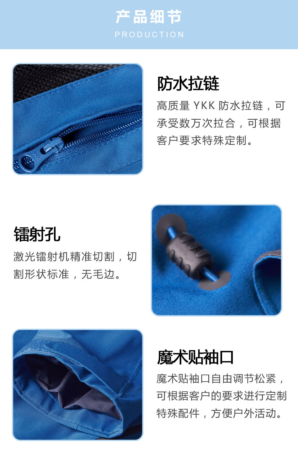 魔術貼袖口:魔術貼袖口自由調節松緊,可根據客戶的要求進行定制特殊配件,方便戶外活動。