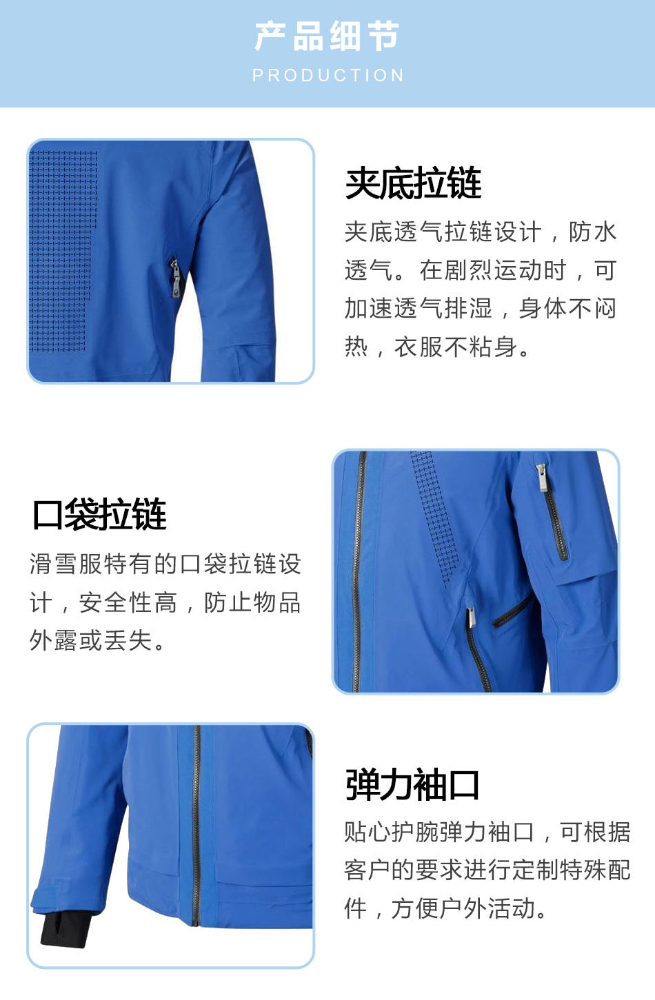 彈力袖口:貼心護(hù)腕彈力袖口,可根據(jù)客戶的要求進(jìn)行定制特殊配件,方便戶外活動。
