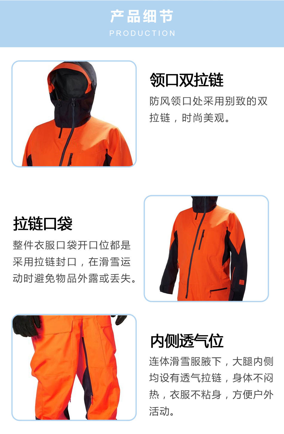領口雙拉鏈:連體滑雪服的防風領口處采用別致的雙拉鏈,時尚美觀。